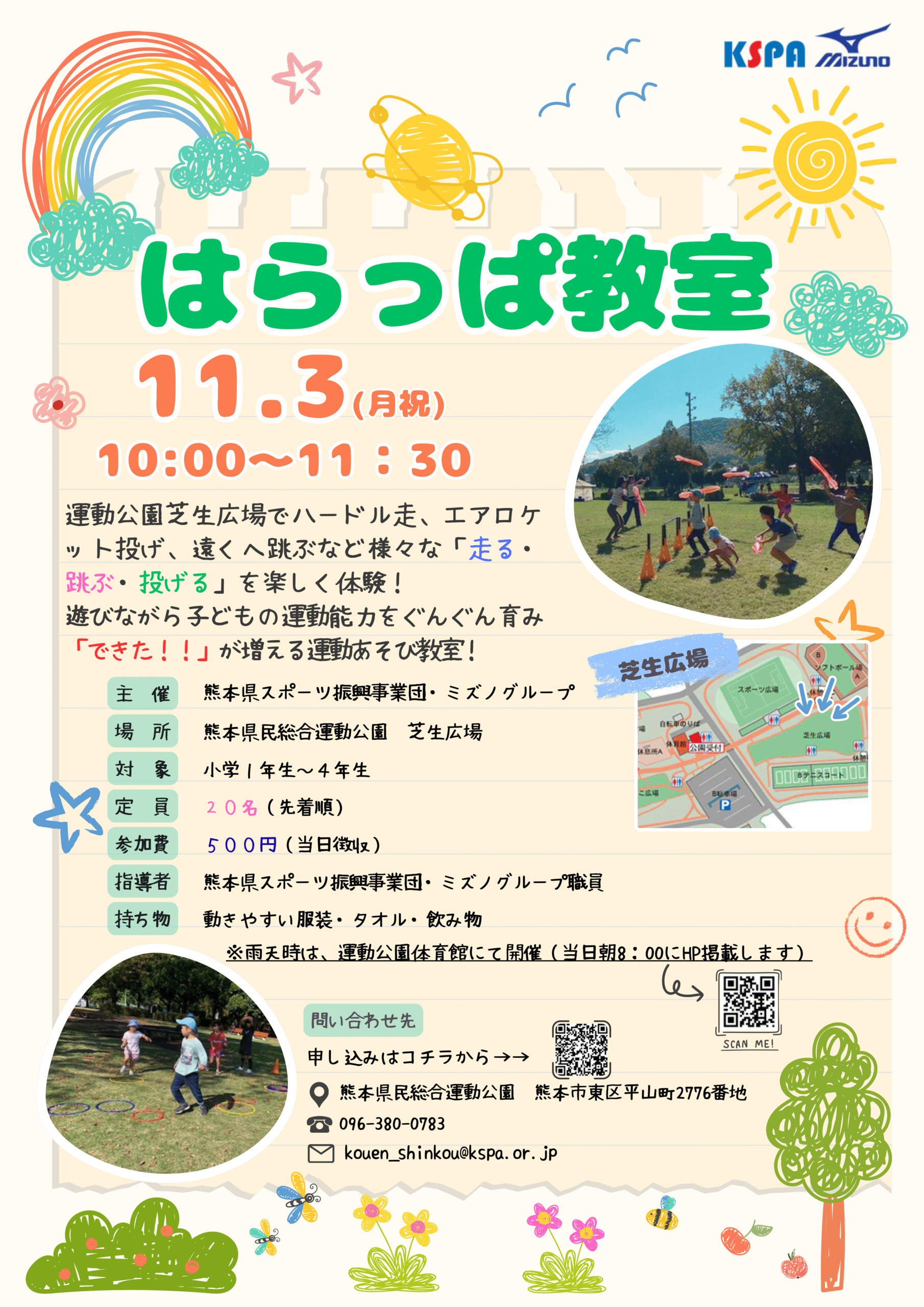 11月3日(月・祝) 熊本県民総合運動公園にて「はらっぱ運動教室」を開催いたします。