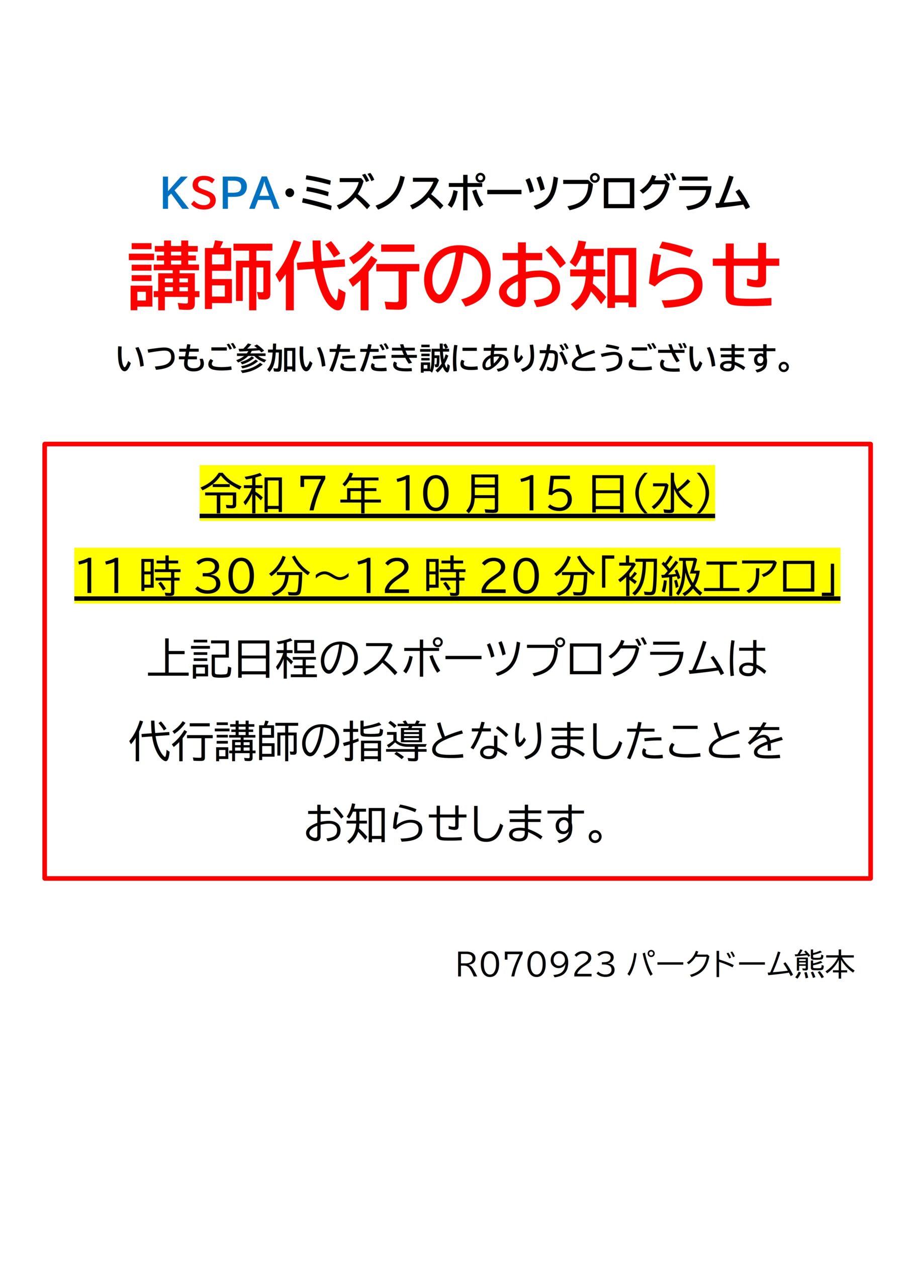 10/15(水)講師代行のお知らせ【初級エアロ】