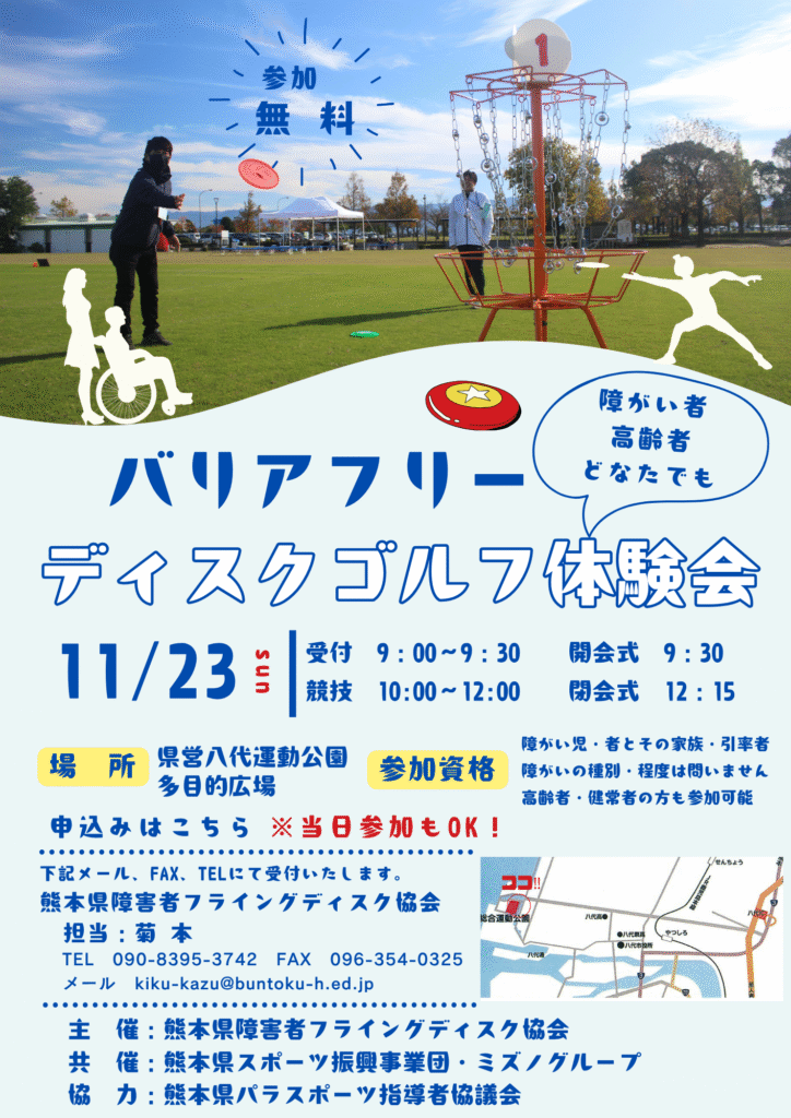 【参加無料】バリアフリー ディスクゴルフ体験会を開催します! 障がいのある方や高齢者の方も気軽に楽しめる「バリアフリーディスクゴルフ体験会」を開催します! 車いす利用者の方や、初めての方でも安心してご参加いただけます。 ご家族や引率の方、健常者の方のご参加も大歓迎です。