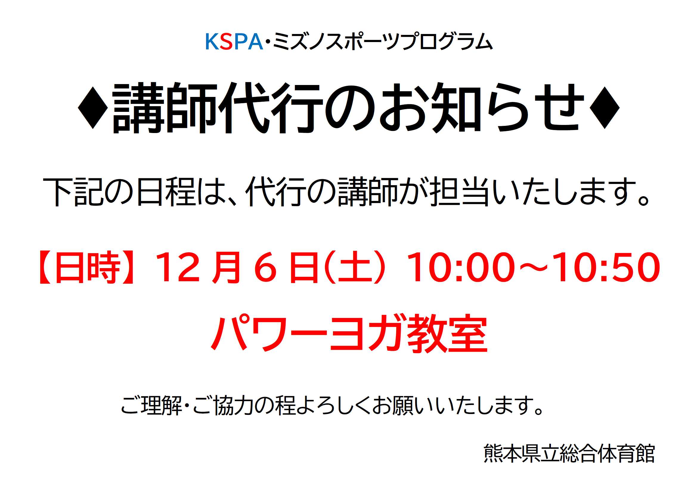 熊本県立総合体育館 スポーツプログラム講師代行のお知らせ