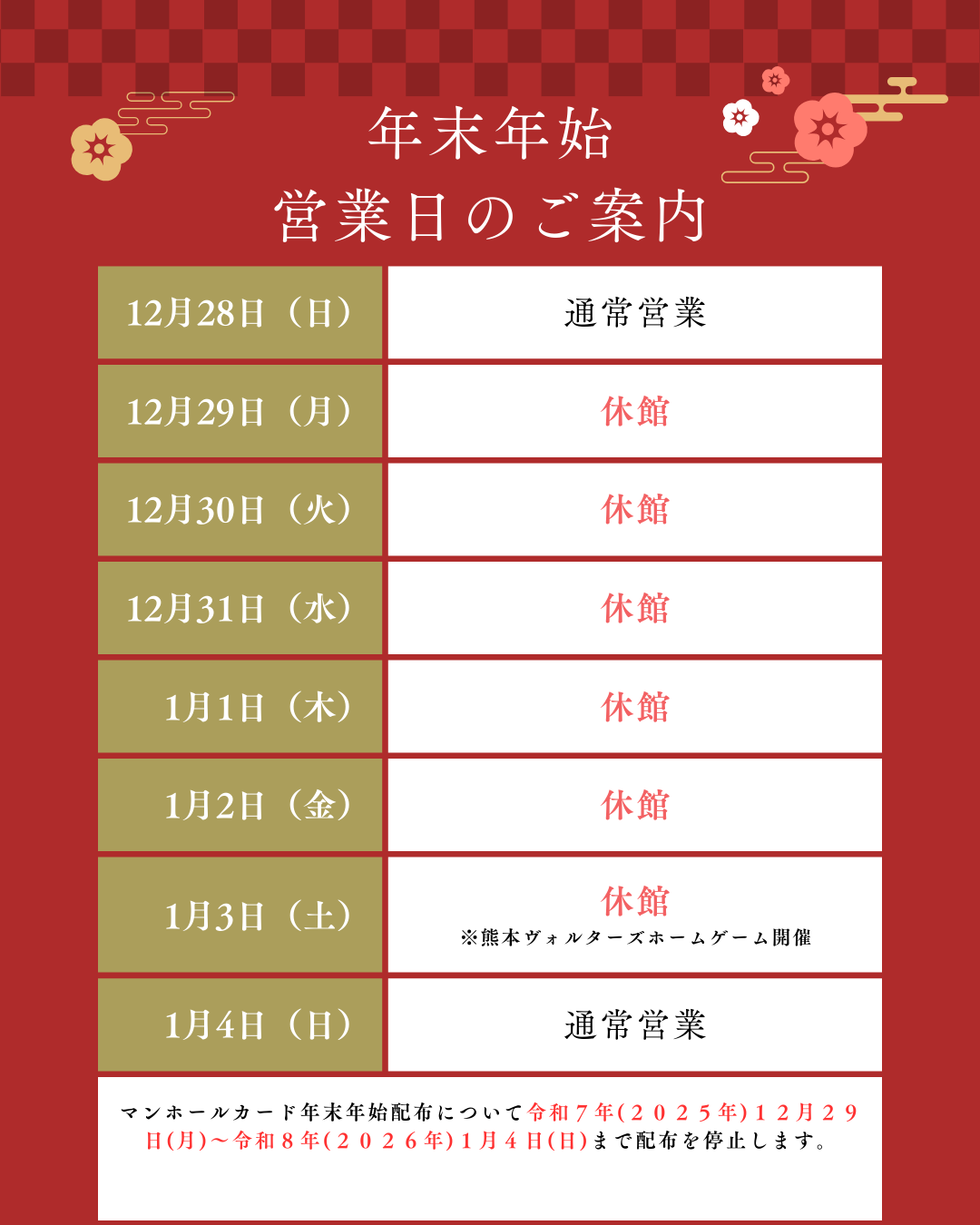 【熊本県立総合体育館】年末年始休館日のお知らせ