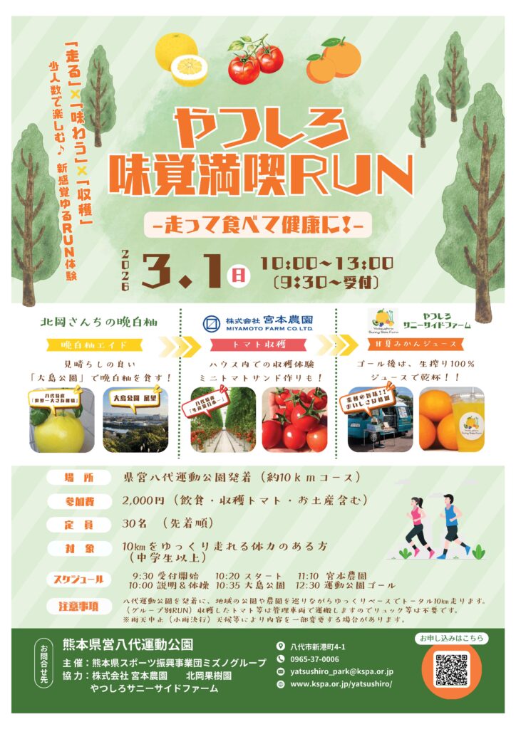 「やつしろ味覚満喫RUN」を開催します。本イベントは、県営八代運動公園を発着点に、地域の農園や公園を巡りながら約10kmをランニングコーチとゆっくり走るグループランです。