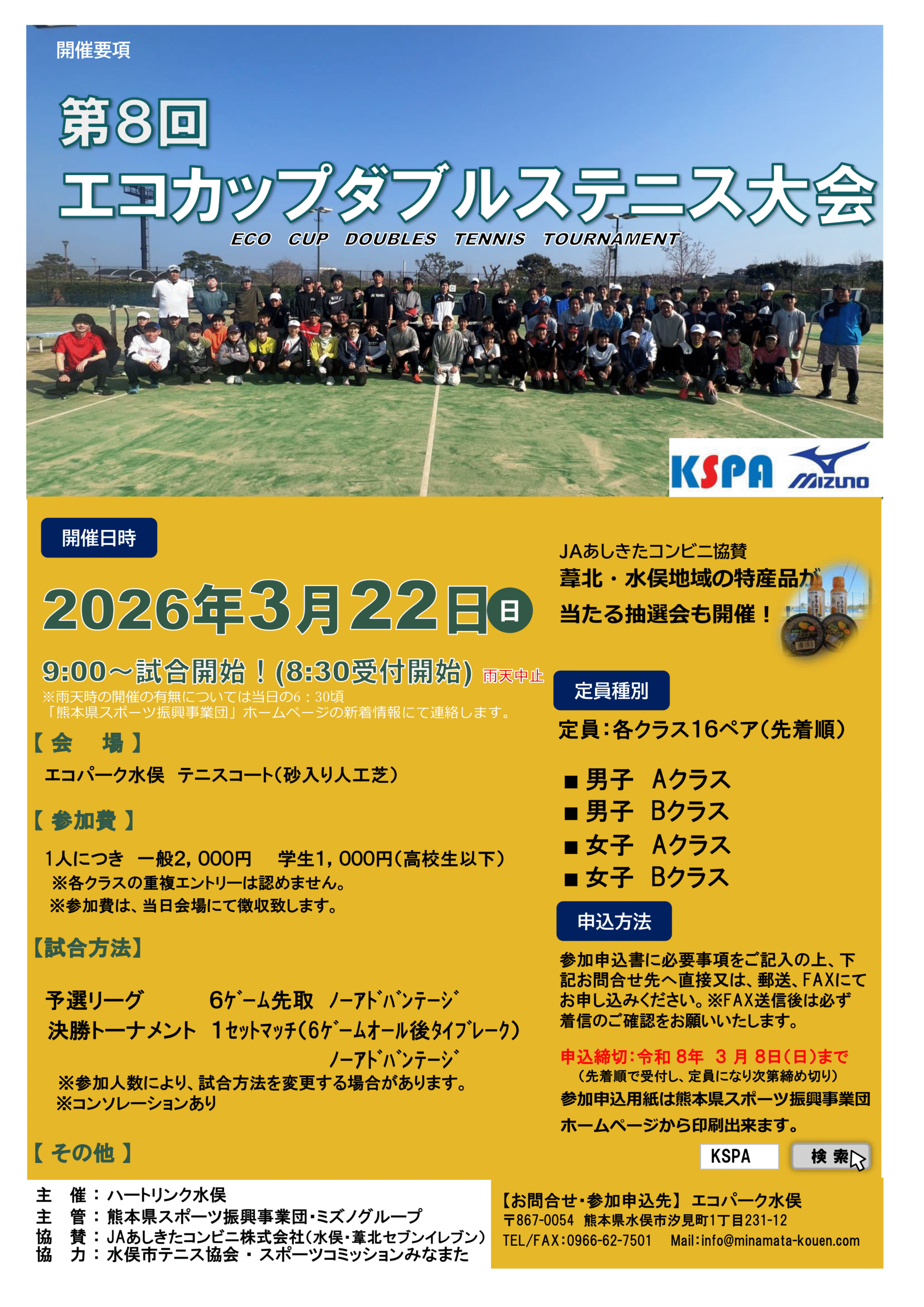3月22日(日)エコパーク水俣にて「第8回エコカップダブルステニス大会」を開催いたします。