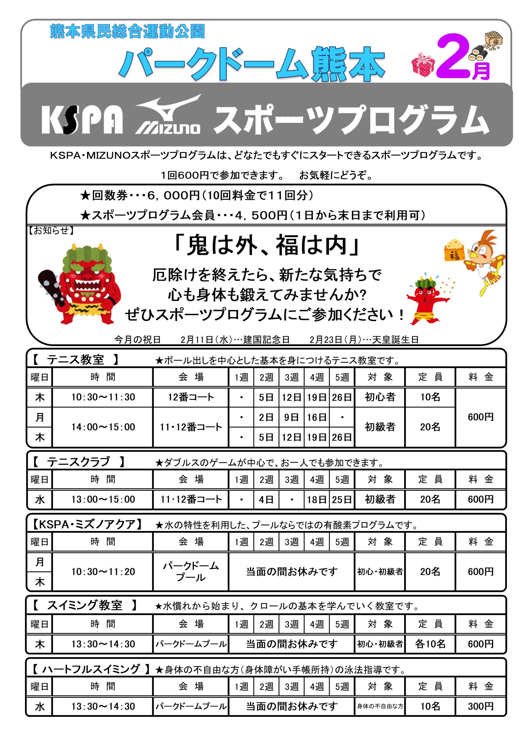 KSPA・MIZUNOスポーツプログラム2月日程表【熊本県民総合運動公園】