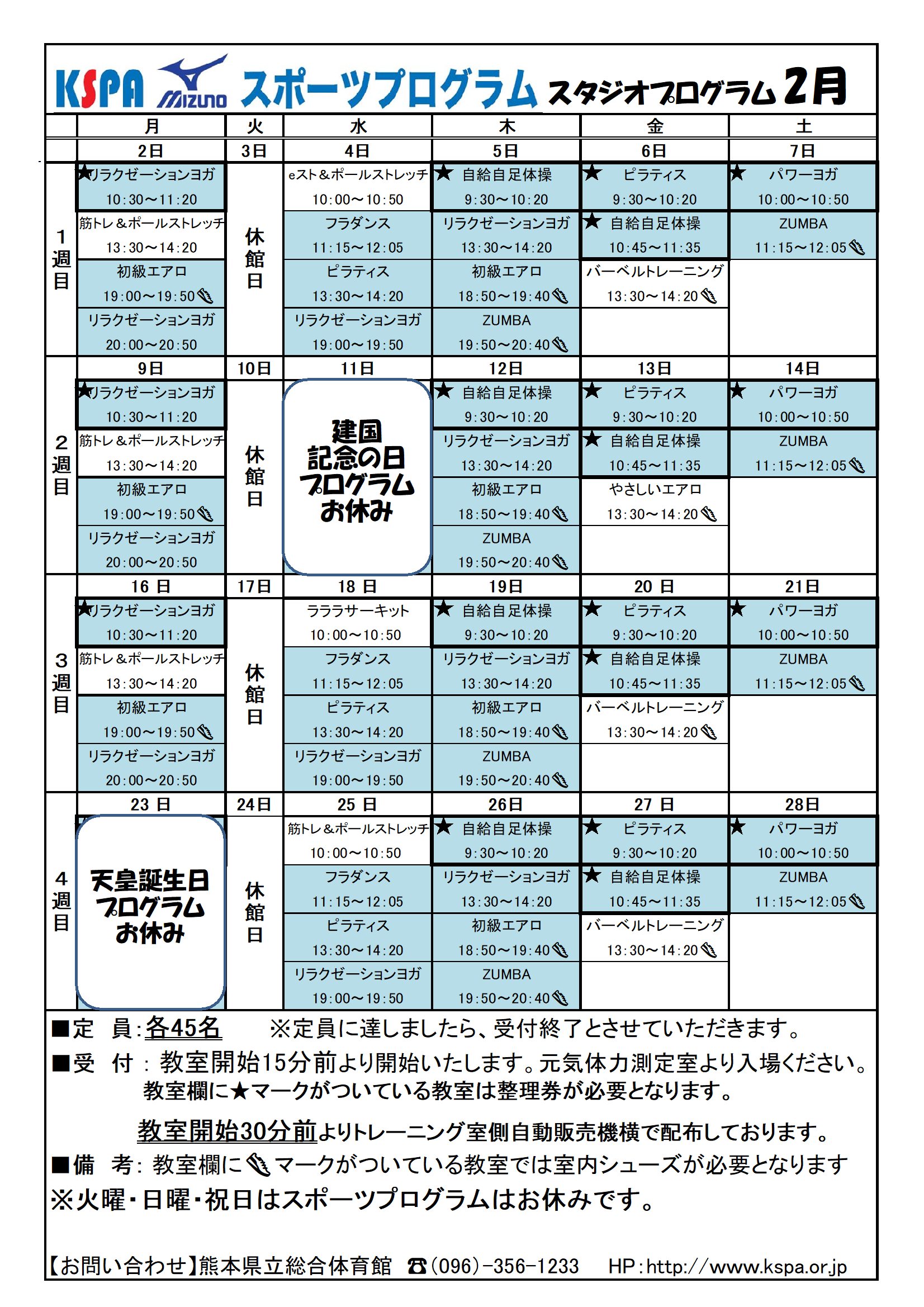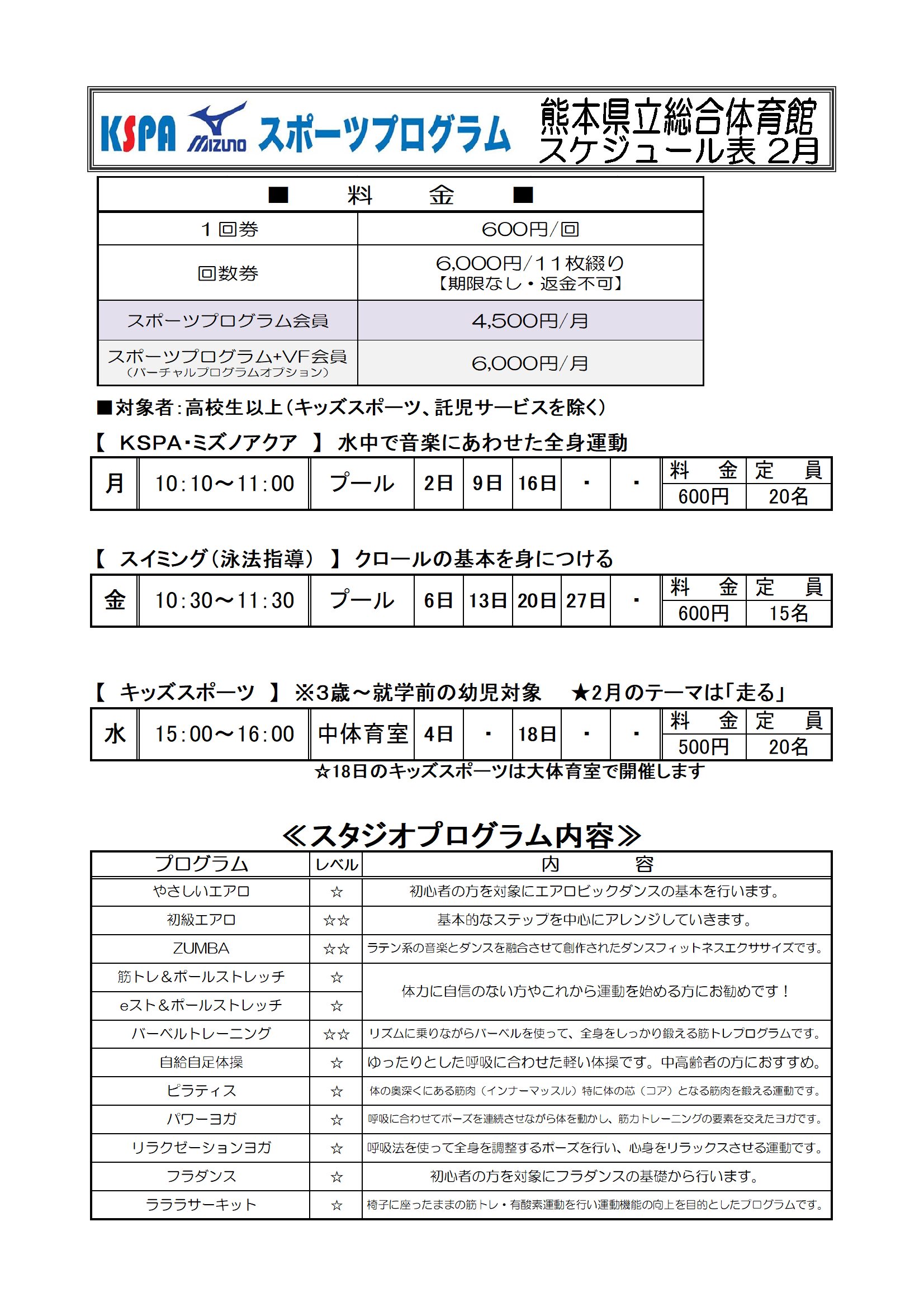 県立総合体育館 KSPA・MIZUNOスポーツプログラム 2月日程表