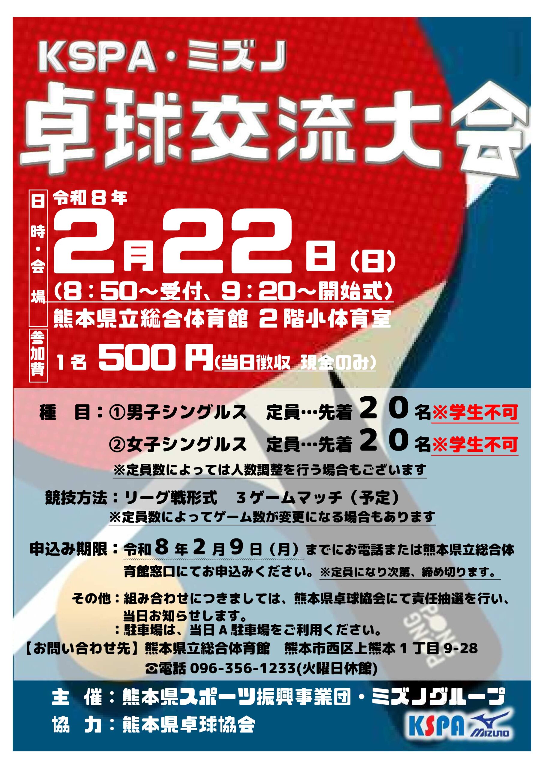2月22日(日)熊本県立総合体育館で「KSPA・ミズノ卓球交流大会」を開催いたします。