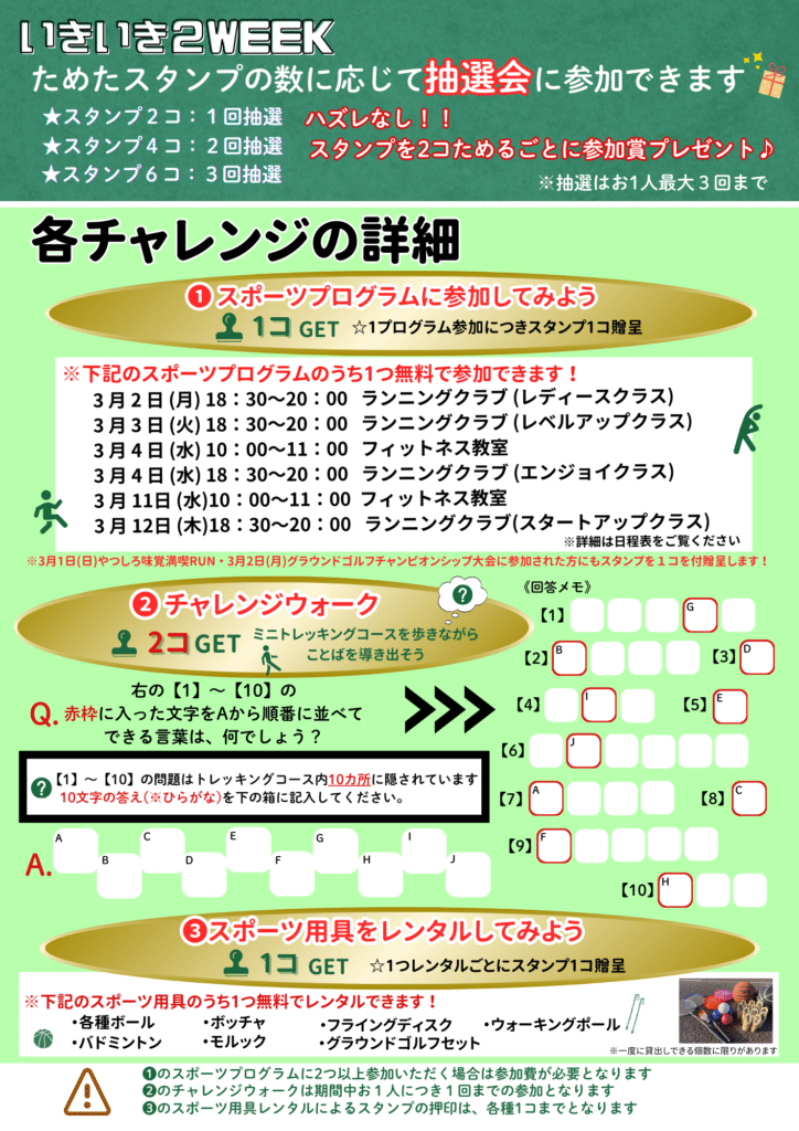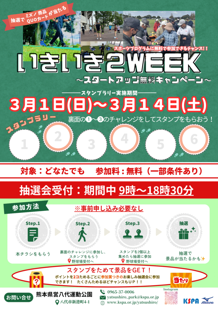スタンプを集めると、抽選でミズノ商品やQUOカードが当たるチャンスもあります 運動が初めての方も、おひとりでも、お友だち同士でも大歓迎!