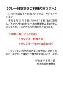 2026.3.4 クレー射撃場をご利用の皆さまへ20260304 コメントを残す コメントをキャンセルメールアドレスが公開されることはありません。 ※ が付いている欄は必須項目ですコメント ※ 名前 ※ メール ※ サイト Δ