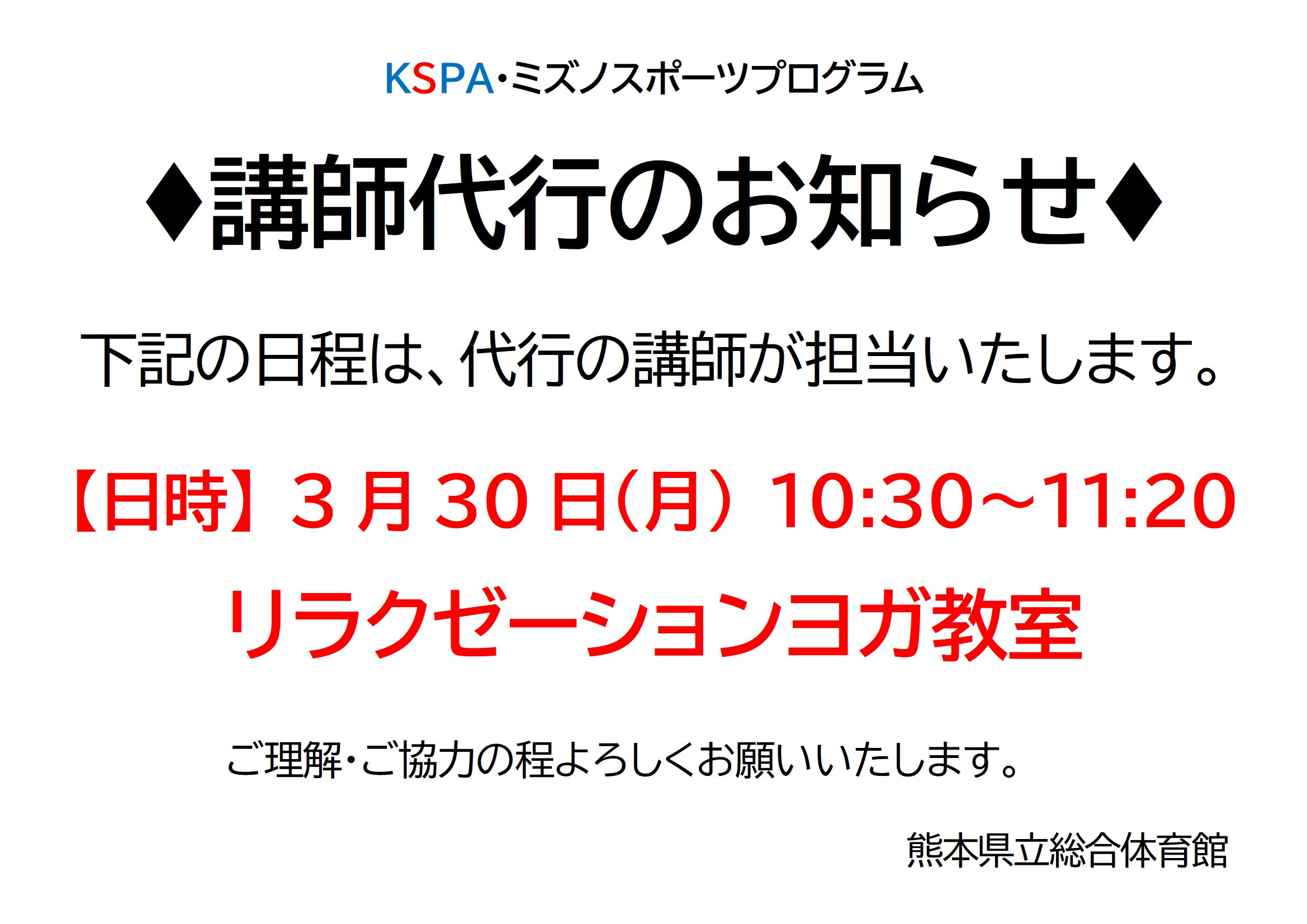 熊本県立総合体育館 スポーツプログラム リラクゼーションヨガ講師代行のお知らせ