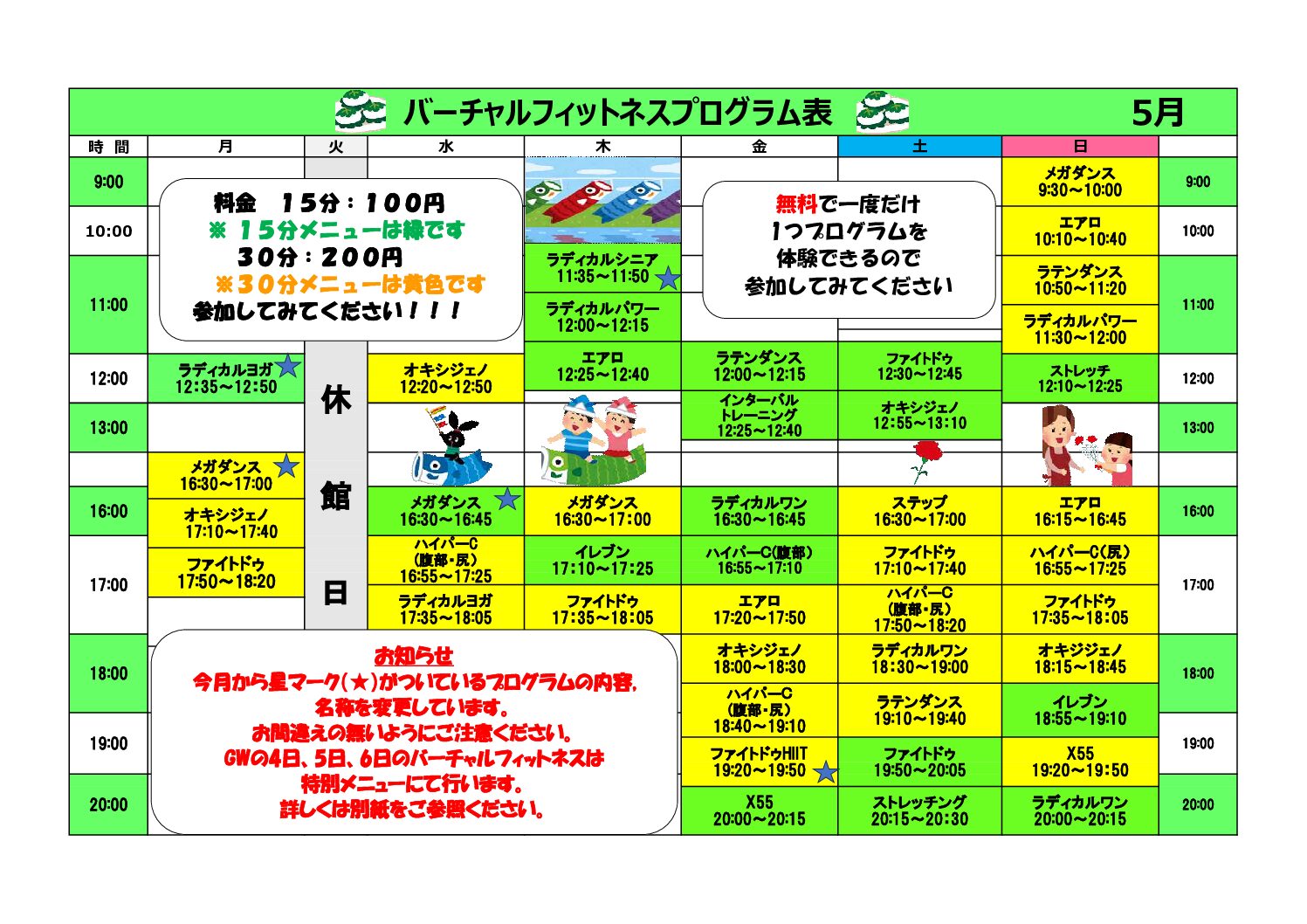 熊本県立総合体育館 バーチャルフィットネス5月日程表