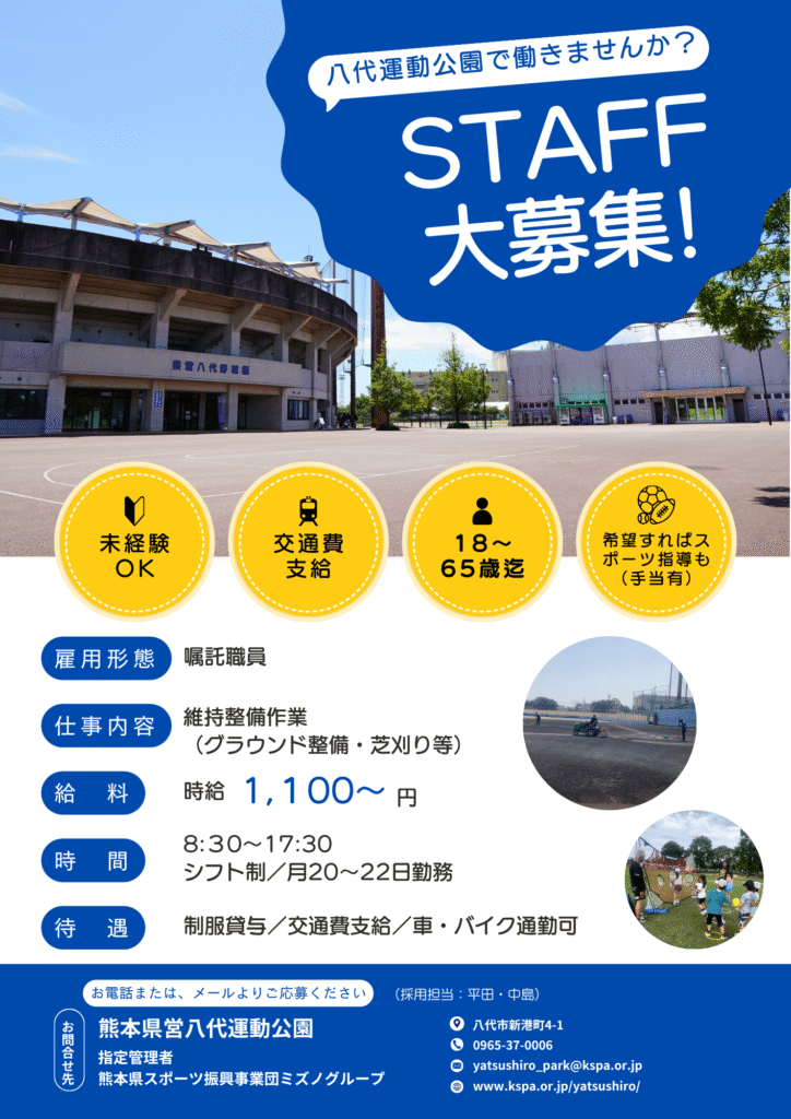 「スポーツが好き!」「外で体を動かすのが気持ちいい!」 そんなあなたを、八代運動公園の新しい仲間としてお待ちしています。